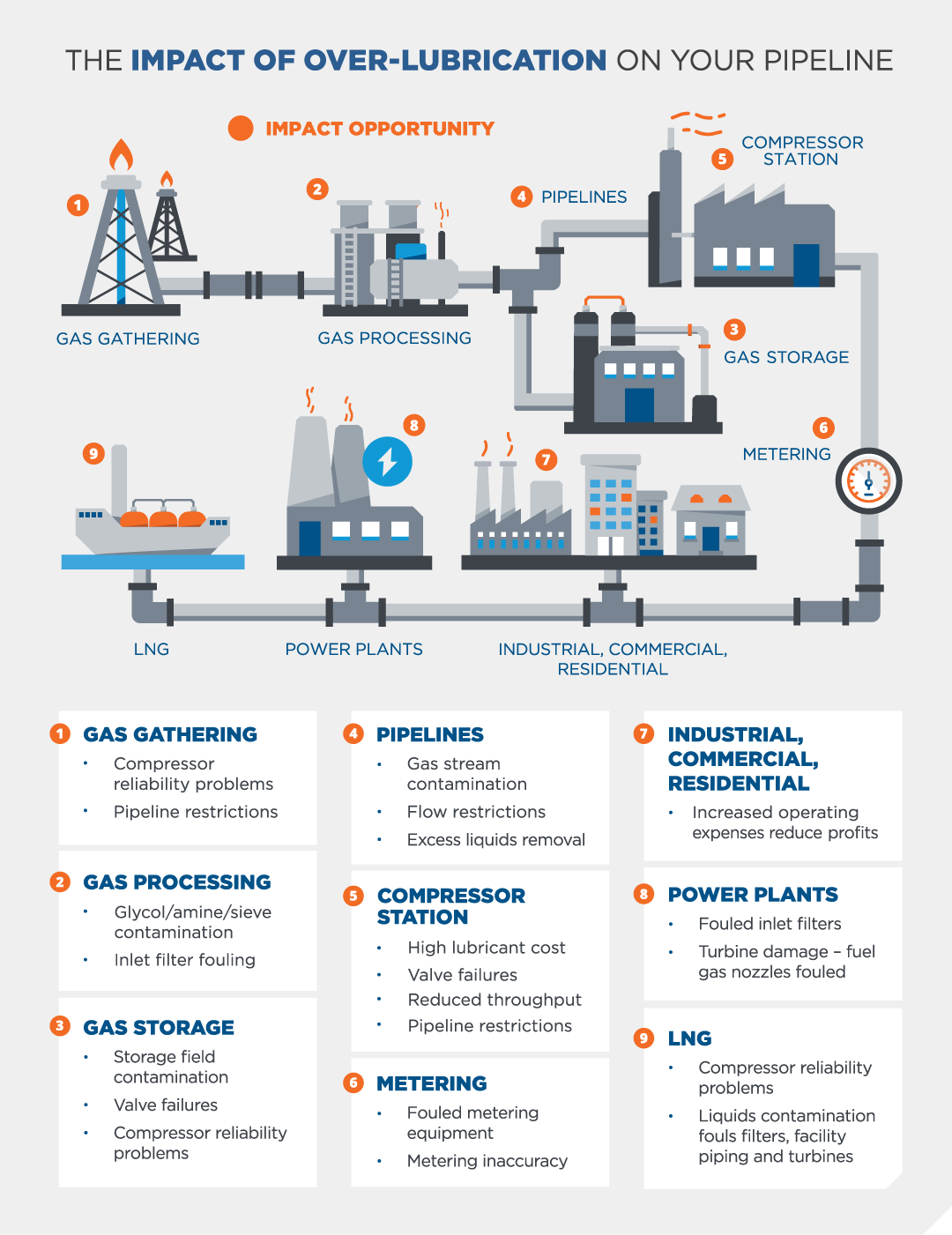 Natural gas pipeline companies spend millions of dollars on projects to improve operational efficiency. In the case of compressor lube oil contaminating the gas stream, it is all too common that those millions are spent to mitigate the effects while failing to address the root cause. The expense from the downstream impact of compressor lubricant carryover is treated as a cost of doing business, but it does not have to be this way.